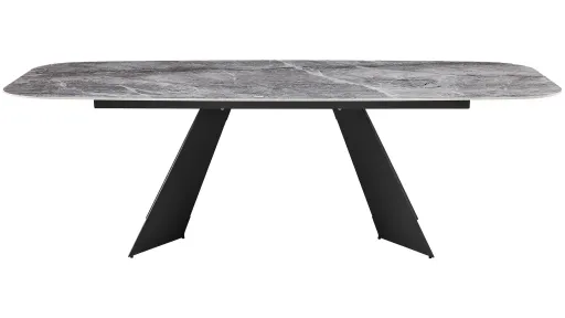The Lizarte Dining Table unites sleek, modern lines with stunning, classic style. The wide table top with rounded corners, made of gray ceramic in a marble pattern. The base and frame, made of matte black solid steel, provide a striking and elegant silhouette. A true mix of modern with functionality.