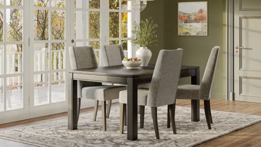 The Logan 5-pc. dining set features a rich finish, clean lines and precise detailing, so you can achieve a polished, sophisticated appearance in your dining room. Each chair is covered in linen-look upholstery and features a broad back to help you get comfortable. If you need to fit in a few extra place settings at the last minute, just extend the length of the dining table using the included 18" leaf.