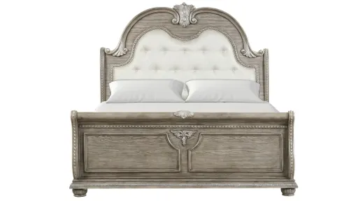Lucca Bed features Carved Wood Trim on the Headboard and Footboard to Match the Accents Found on the Mirror and Case Pieces. Fit for a Mansion, This Bed will Become the Centerpiece of Any Bedroom. Available in King or Queen Size. A Box Spring or Foundation is required and is not included.