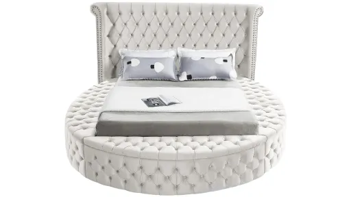 Luxus bed is Marvel at the remarkable beauty and graceful lines. The headboard, footboard and side rails are all adorned with deep button tufting, and there is nail head trim on both sides of the tall headboard. The footboard and side rails all contain ample storage and seating, making it easy to sit down in comfort so you can put on your pants or shoes.