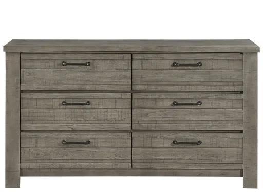 Mackinac Dresser is straightforward look making for a perfect addition to your bedroom. A gray finish is utilized over birch veneer, highlighting the wood's grain. The planked framing gives the dresser a rusticated aesthetic while the metal bar hardware lends an industrial touch.