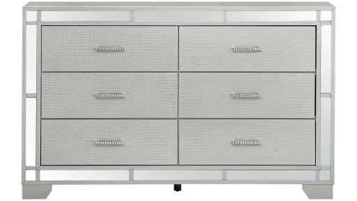 The Madison Bedroom Group Features a Textured "Croc"Front Finished in A Silvery Champagne. Mirror Trim on the Case Front and Faux Jeweled Handles Makes this Piece Sparkle! Fully Assembed and Safely Constructed with Anti Tip Anchor Supplied.