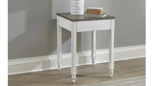 Simple and sophisticated, the Magnolia Manor Corner Filler is crafted of poplar and rubberwood solids with white oak and birch veneers. This piece features an antique white finish with heavy chipping and distressing with a weathered brown top with whitewash. The chamfered legs add a level of design appeal. This piece can be used as a part of the Magnolia Manor L-shaped desk set or can stand alone as an end table or accent piece in your home. Blending of European influences makes Magnolia Manor a truly unique style for any home.