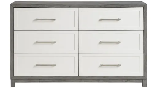 Modern farmhouse styling of the Marceline Dresser presents as a timeless design perfect for your bedroom’s décor. The two-tone finish over okume veneer is a classic color combination that serves as the perfect pallet for your decorative preferences. X paneling fronts the headboard while the drawer units of the footboard allow for additional storage space within your room. Polished nickel-tone bar hardware fronts the dresser.