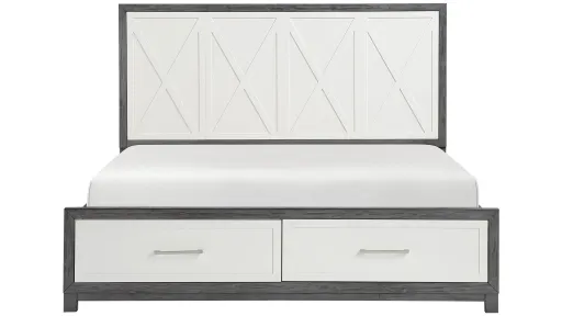 Modern farmhouse styling of the Marceline Platform Bed with Storage presents as a timeless design perfect for your bedroom’s décor. The two-tone finish over okume veneer is a classic color combination that serves as the perfect pallet for your decorative preferences. X paneling fronts the headboard while the drawer units of the footboard allow for additional storage space within your room. Polished nickel-tone bar hardware fronts the storage footboard.