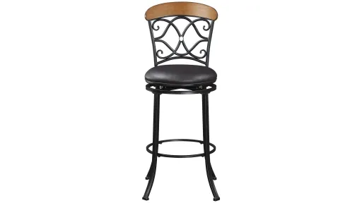 Maude Swivel Pub Height Stool provides a stylish seating option for your home's transitional casual dining space. Black metal framing supports the 360-degree swivel seat, while the scrolled metal seatback is topped with a wood rail. The Maude Collection is offered in both 24-inch and 29-inch heights.