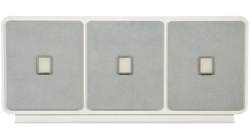 Melange Atlantis Credenza has rounded corners on a rectangle shape, raffia-wrapped door fronts and a creamy white plinth base, sides and front. Dramatic square-shaped hardware is silver-colored metal with white painted glass. The three doors have soft-close hinges and magnetic door catches with one adjustable shelf behind each door, a ventilated back panel and a three-plug electrical outlet behind the middle door. The pale blue tone of the raffia-wrapped doors is inspired by Caribbean beaches.