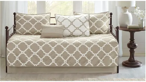 Create a simple yet chic look in your room with the Merritt Daybed Set. A white fretwork print on the daybed cover creates a classic look that pops against the rich taupe base. Three matching shams are reversible to coordinate with the top of the bed and the reverse, for a stunning mix-and-match style. The daybed cover also reverses to a white base with a taupe fretwork design, allowing you to easily change up the style of your room. An embroidered decorative pillow and a solid bed skirt complete this classic look. Machine washable for easy care, this daybed set adds the perfect amount of style and color to your space.