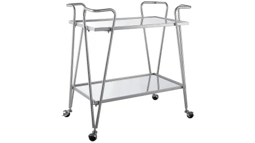 Ideal for entertaining, the Mid-Century Bar Cart is designed in classic mid-century modern style that will make any gathering feel special. Elegant tubular steel construction is finished with a silver powder coating that cradle two spacious shelves. Both shelves are the same size, feature a mirrored top and are surrounded by a slight lip so items will not roll off. Casters have a matching silver hood with black wheel and once the cart is rolled into place, locks keep it stationary. More than a bar cart, bring elegance to breakfast or coffee service in the morning or use as an accent piece that shows off collectables or art pieces.