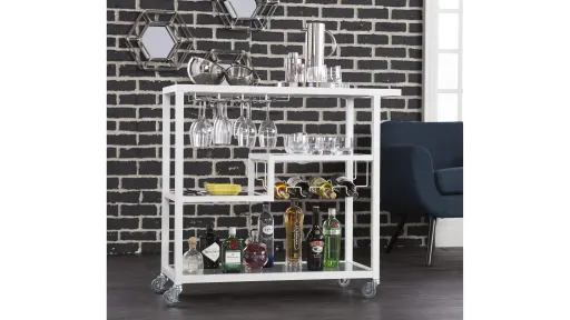 Keep the party rolling with the Miller Bar Cart. Crisp white frames smoky gray glass for high contrast contemporary style. Stemware racks and bottle holders keep your breakables in place, shelves handle mixers and assorted accoutrement. Casters keep you on the move or locked in position.