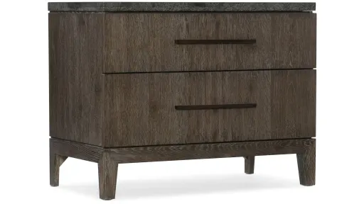 Exuding a global vibe, the Marimar Nightstand has a rich rustic Smoky Arabica finish over tactile White Oak and Pine Knotty Oak Veneers, accented by a Bluestone top. Featuring two drawers with self-closing drawer guides, one electrical outlet and a touch dimmer switch for your lamp.