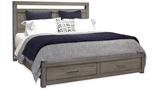 Modern Loft Panel Bed with Storage is made up of beautiful Mindi veneers with a distinctive grain pattern and includes a wide variety of special features and functionality. The aged bronze finish hardware and clean lines offer a look that is both stylish and timeless.