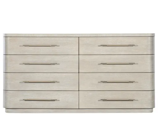Modern Mood Dresser is a stunning statement piece. The case has rounded corners and a plinth base and offers 8 self-closing drawers. The top two drawers have drop-in felt liners, there's a removable jewelry tray in the top right drawer and the bottom two drawers are cedar-lined. Crafted of Oak Veneers, the dresser is finished in the serene Diamond color and accented by metal pulls wrapped in leather.
