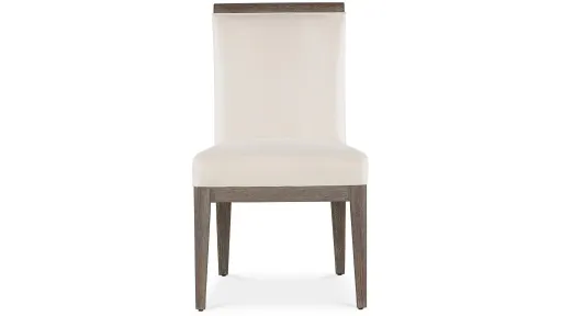 Modern Mood Side Chair featuring a comfortable upholstered seat and back. The wood trim along the top of the chair and the wood base and legs are crafted of Flat-Cut Quartered Oak Veneers with wire-brush detailing in a dark finish with, earthy brown hues with notes of black, delivering a soft sophistication. The versatile chair is upholstered in the Cottony Cotton cover.