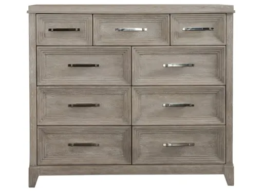 Add luxury and sophistication to your bedroom with the Montara Dresser. The washed taupe and silver champagne finish is accented by the graduated drawer front mouldings and custom satin nickel hardware. The grand-scale of this piece makes it perfect to organize all your belongings in the 9 full extension drawers, where the bottom drawers are equipped with dust proofing to protect your belongings.