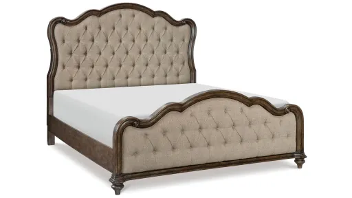 The elegant profile of the Moorewood Park Bed is comprised of classic elements that have been combined to create the perfect addition to your home's traditional dcor. The formal styling of the bed includes classic elements such routed edges and decorative wood grain. The neutral hued brown button-tufted fabric of the headboard sets the tone for the refined presentation of the wood framing of the bed. The white oak veneer that graces the collection is highlighted with a brown oak finish.