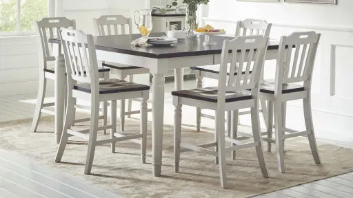 A striking pairing of a rich, dark top with a soft grey base, the Mount Vernon 7-pc. counter-height dining set provides an inviting stage for entertaining. With a leaf extension, the table is able to accommodate up to eight people. This set was made for dinner parties and family dinners. Solid wood construction offers the promise to withstand the wear and tear of those same dinners- and look good doing it.