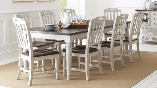 A striking pairing of a rich, dark top with a soft grey base, the Mount Vernon 7-pc. dining set provides an inviting stage for entertaining. With a leaf extension, the table is able to accommodate up to eight people. This set was made for dinner parties and family dinners. Solid wood construction offers the promise to withstand the wear and tear of those same dinners- and look good doing it.