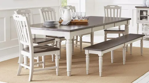 A striking pairing of a rich, dark top with a soft grey base, the Mount Vernon 6-pc. dining set provides an inviting stage for entertaining. With a leaf extension, the table is able to accommodate up to eight people. This set was made for dinner parties and family dinners. Solid wood construction offers the promise to withstand the wear and tear of those same dinners- and look good doing it.