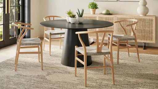 Modern curves redefine classic wishbone seating with the Muestra dining chair. Vintage white all-weather wicker is woven for a dose of fresh texture against a neutral frame of natural teak. Cover or store indoors during inclement weather and when not in use.
