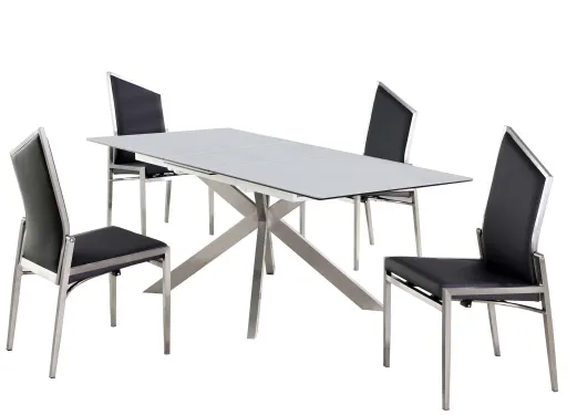 This Nala dining set features a textured ceramic top table with a self-storing, 16" pop-up extension that opens the table from 63” to 79". The brushed, stainless steel pyramid base also matches the trim and legs of the included chairs.