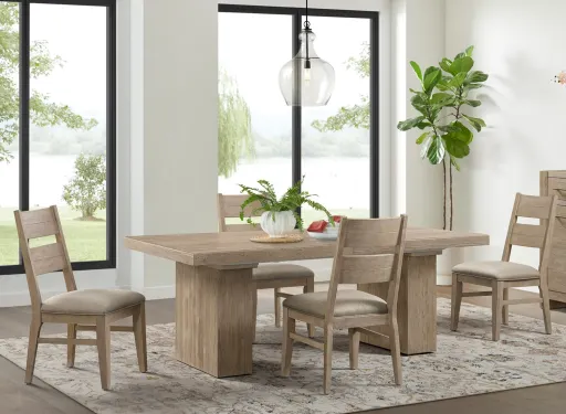 Nash 5-pc. Dining Set features clean, modern design elements blended with the casual nature of lightly wire brushed pine solids and veneer. Shown in a beautiful Weathered Sand finish. The cast bar pull hardware on the Sideboard has an antique pewter finish.