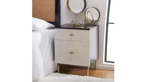 Elegant and modern, the natural beauty of the Nero nightstand adds style and warmth to any bedroom. Finely crafted of mahogany wood, Nero's rich black finish and gold metal legs give it vintage style charm. Two spacious drawers make for easy storage.