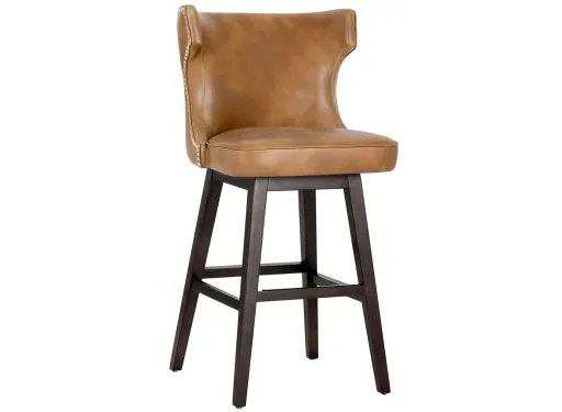 Neville Swivel Barstool features a sculpted wing back with silver nailhead detailing. Stocked in a vintage-look havana dark brown and tobacco tan faux leather with espresso wood legs. Stretchers and a black metal footrest plate add durability. Suitable for various dining, kitchen and bar spaces of all sizes. Handle With Care: This design has been crafted with faux leather. Faux leather is manufactured to reflect the natural characteristics of leather; as such, colour variations, markings, wrinkles, grooves, and light scratches are appreciated characteristics. No two pieces will be alike. Visit our Product Care page for more information on how to ensure the lasting beauty of this piece.