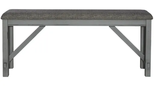 Sit in comfort and style with the Newport Counter Height Dining Bench. Crafted with excellence using rubberwood solids, this bench features a Smokey Grey finish and an upholstered seat in Grey Linen fabric. The square block legs feature wooden peg accents for a craftsman's feel and nylon chair glides to protect your flooring. The center trestle on this bench ensures stability. Feel comfortable and elegant at the same time with the Newport counter height dining bench.