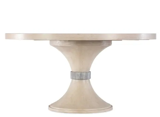 With an hourglass-shaped pedestal base tied in the middle with a metallic-finished collar, the Nouveau Chic Dining Table brings serene style to any space. Crafted of Oak Veneers and Resin with a sunburst veneer pattern on top, the table has a Sandstone finish. Accommodates up to 6 coordinating chairs.