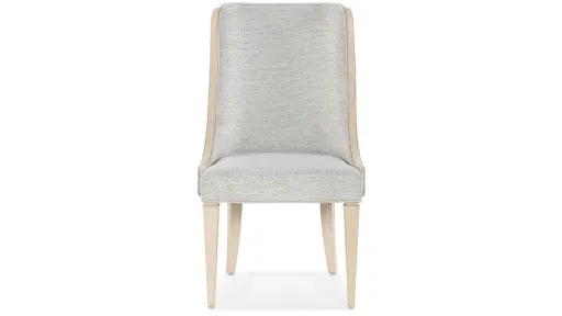 A slender, svelte silhouette, the upholstered Nouveau Chic Host Chair (set of 2) has a slipper design with wood trim along the sides and top of the back. The trim in Cathedral and Quartered Oak Veneers is finished in the serene Sandstone with wire brushing and a masterful combination of transparent and opaque stains. The Sand fabric is a silk-linen blend.