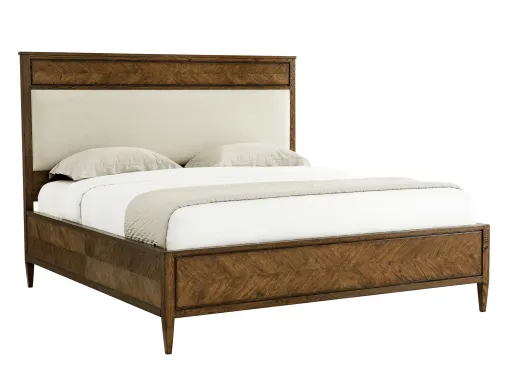 An undeniable super Nova, this rustic oak design of the Nova US Queen Bed, seen in our Dusk finish, captures the essence of a classic silhouette, with a hand-carved starburst design. Featuring an upholstered panel headboard with a framed oak side rail and tapered finished leg.