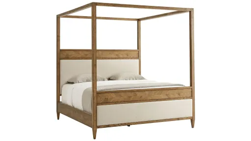 Crafted from oak and displayed in the Dawn Finish, the impressive Nova Poster Bed is an instant classic with its popular poster bed frame. Hand-carved oak solids and mirrored herringbone marquetry with an upholstered panel on the headboard and footboard, this bed will surely make a statement in your bedroom. Finished on a finely tapered oak leg.
