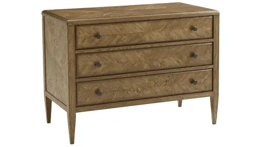 Modernly rustic, the Nova Chest of Drawers II is the perfect accent piece for your home. With three Dawn finished mirrored herringbone oak parquetry drawers, classically tapered legs, and six Verde Bronze finish handles, this hand-carved chest will complement a number of different styles.