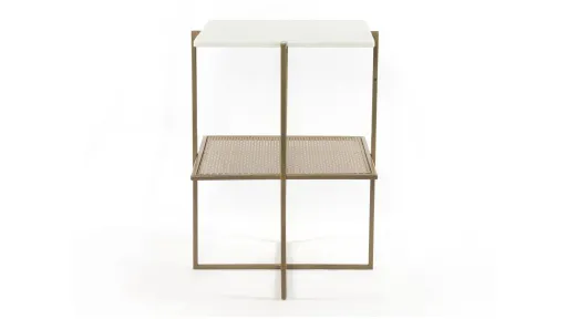 Add a pop of sophistication with a two-tone touch. Slim, antique brass-finished iron forms an X to support tiers of perforated metal and polished white marble for a look of simple grace.