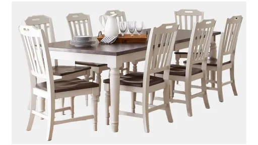 A striking pairing of a rich, farmhouse dark brown top with a soft modern grey base, the Orchard Park Dining Set provides an inviting stage for entertaining. This nine-piece dining set includes one large dining table and eight matching dining chairs. this collection was made for family dinners and weekend get togethers, a stunning combination of country style and beautiful solid hardwood.