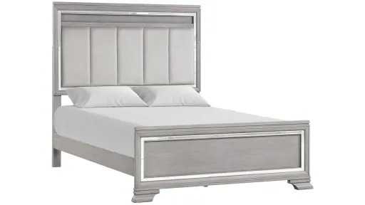 The Padua Bed features embossed wood with a wood grain design and mirror trim on the headboard and footboard. Upholstering on the headboard is in gray velvet with a soft suede feel. LED lighting accents on the headboard for a completely unique look. A boxspring or foundation is needed and is not included. Available in king, queen or full size