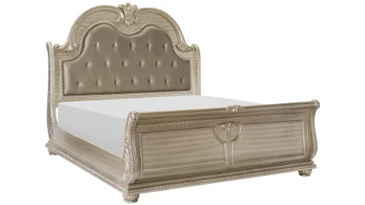 The Palace eastern king bed exemplifies the finest in old world European design inspiration. Egg and dart base moldings, bead molding and acanthus leaf carvings all blend to achieve an elegant addition for your traditional bedroom. The grand sleigh bed features a bi-cast vinyl, button-tufted headboard insert. The bed's beautiful details are accented by the silver finish on birch veneer.