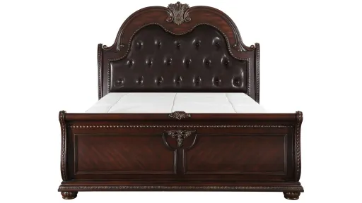 The Palace king bed exemplifies the finest in old world European design inspiration. Egg and dart base moldings, bead molding, acanthus leaf carvings all blend to achieve an elegant addition for your traditional home. The grand sleigh bed features a bi-cast vinyl, button-tufted headboard insert. Each of the collection's beautiful detail is accented by the dark cherry finish on birch veneers with gold highlights