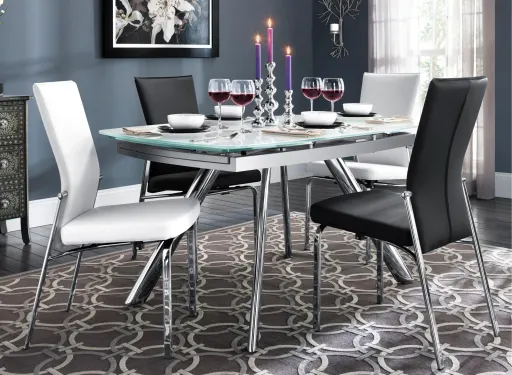 If you're searching for dining room furniture with a bold, modern aesthetic, look no further than the Paloma 5-pc. glass dining set. Its polished frames create a current feel, while leather-look chairs and a tempered-glass tabletop add a stylish complement. Plus, two 17" self-storing leaves let you make extra room when your dinner guests arrive.
