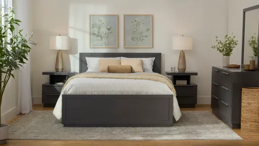 For clean, uncluttered style that’s simple but far from ordinary, look no further than the Paramore bed with integrated side storage on each side. Featuring sleek lines and a low profile, it feels both calming and carefully curated. Base rail LED lighting adds warm ambience.