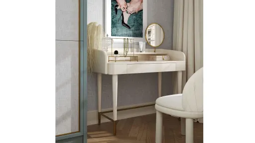 Indulge in the boutique hotel elegance of the Penelope Vanity Desk. This piece oozes sophistication with its uber-chic design, while its velvet-lined drawer and convenient shelf provide a touch of luxury for all your beauty essentials. Complete with a glamorous attached mirror, it's the perfect companion for those "Get Ready with Me" moments, making your daily routine feel like a red-carpet event.