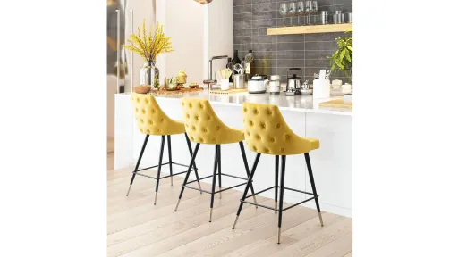 The Piccolo Counter-Height Stool has its tapered back with button tufting is easy on the eyes and gorgeous from every angle. Support slats provide a comfortable footrest while seated.