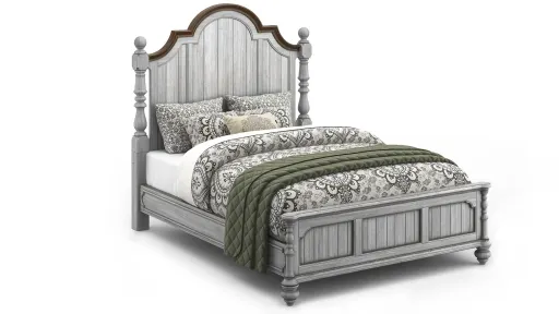 Drift off to sleep in the cozy, cottage-style Plymouth Poster Bed, featuring charming, paneled accents and detailed molding on the headboard and footboard. This bed is crafted with high-quality construction, ensuring it can be enjoyed for generations to come. The graceful, scalloped profile of the headboard and intricately carved posts make this bed a statement piece. Finished in a distressed gray wash highlighted by contrasting medium brown accents, the poster bed brings warmth and character to any bedroom.