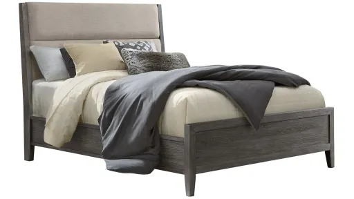 The Portia Queen Bed is a contemporary dream for your bedroom. The headboard stuns with clean lines and upholstery that is complemented by the spruce veneers and solids. This bed is the perfect piece to finish your room.