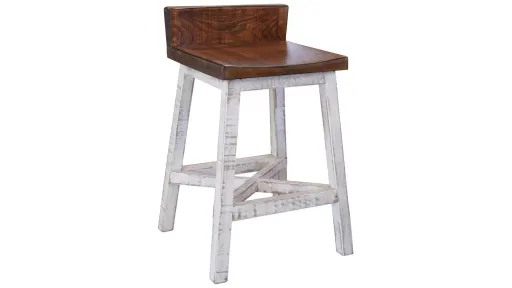 The Pueblo Collection features a white antique finish on distressed wood with a medium brown stain on the seat for depth and character. This barstool is constructed with hardwood and features English Dovetail and Mortis and Tenon case construction. It has a weight capacity of 250 lbs and is displayed online only.