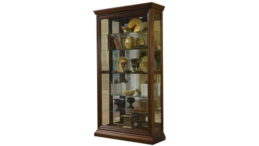 In the style of fashionable 19th century handmade, this curio features rope-twist embossing, beveled glass, a weighty cornice, and stepped moldings on the base. The rich Edwardian finish emulates fine traditional wood finishing. This curio is tall and wide, but not too deep. It can fit most anywhere and hold most anything. The curio includes a mirrored back, halogen lighting, adjustable glass shelves, adjustable glides for leveling, and right-side entry.