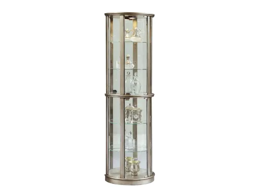 Show off your love of sparkle with this jewel of a curio. This piece would be a real focal point in small spaces. Or, flank two along an entryway to light up an entire room, as appropriate for a platinum blonde. This Demilune curio is built in select hardwood solids and veneers and our sparkling Platinum finish. It includes two doors, a mirror back, high/low halogen lighting, and four adjustable glass shelves.