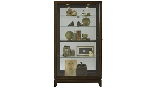 Some household pieces are as lovely as they are practical, and the beauty they can add to a home is yours for the arranging. Our tall curio is solidly built in select hardwood solids and veneers and a deep Chocolate Cherry finish that gives a fresh and bright appearance. This curio has a two-way felt-lined sliding door with lock. It includes beveled glass on the front, a mirrored back, halogen lighting, adjustable glass shelves, and adjustable glides for leveling.