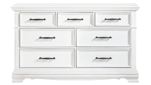 Elevate your bedroom's organization and aesthetic with this elegant Pure Dresser. Expertly crafted from a durable combination of solid wood and engineered wood, this dresser boasts a crisp white finish that instantly brightens any space. With seven spacious dovetail drawers, all equipped with smooth ball-bearing glides, you'll have ample room to neatly store clothing, linens, and accessories. The striking black nickel-tone bar pulls provide a stylish contrast, enhancing the dresser's timeless appeal. This versatile and robust piece offers both exceptional storage capacity and a refined look, making it a perfect addition to any modern or traditional bedroom.